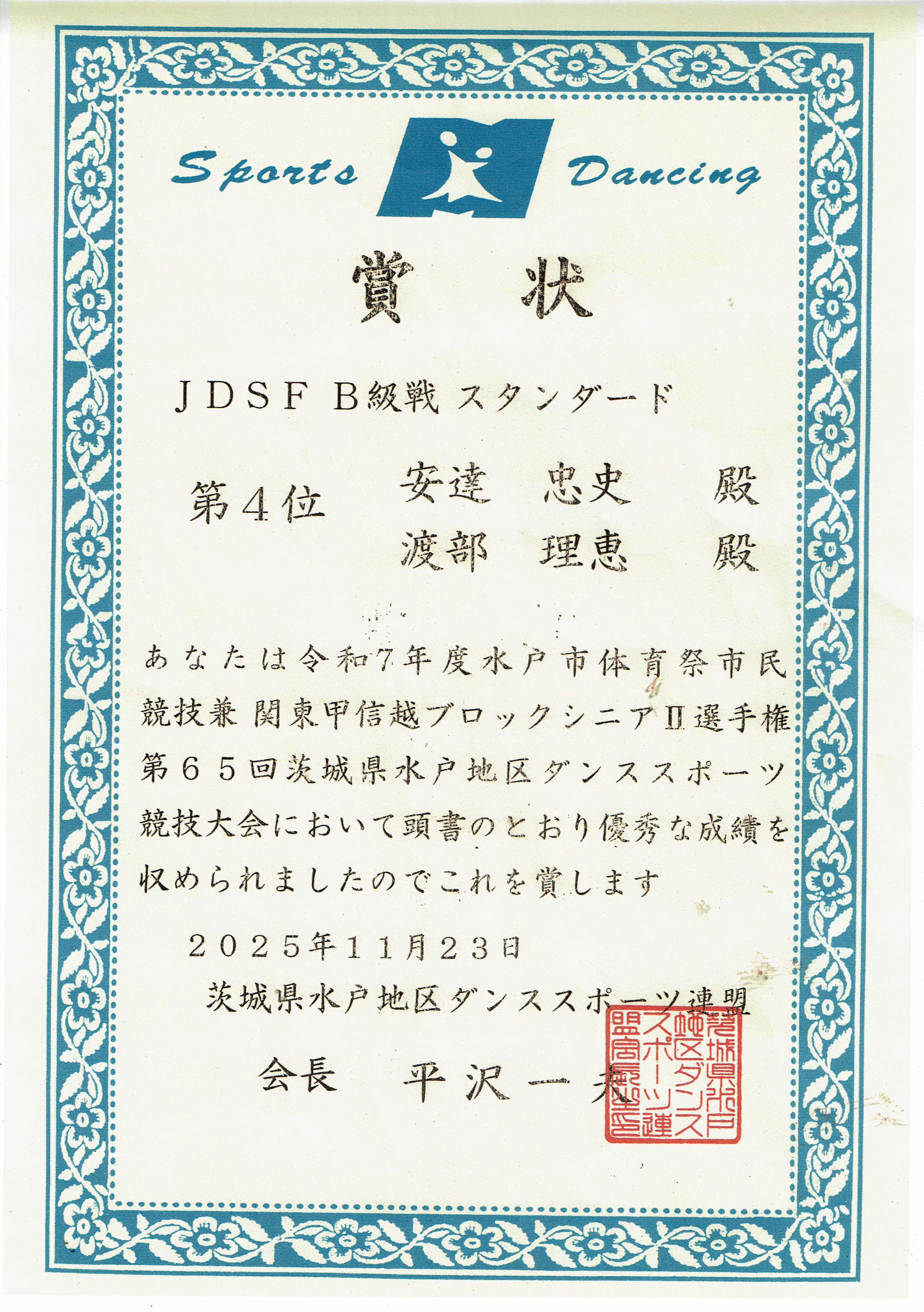 11月23日に行われました“第65回茨城県水戸地区ダンススポーツ競技会 JDSF B級戦スタンダード”におきまして、当教室会員の『安達忠史・渡部理恵 組』が 第4位 という優秀な成績をおさめられました!おめでとうございました~ \(^0^)/