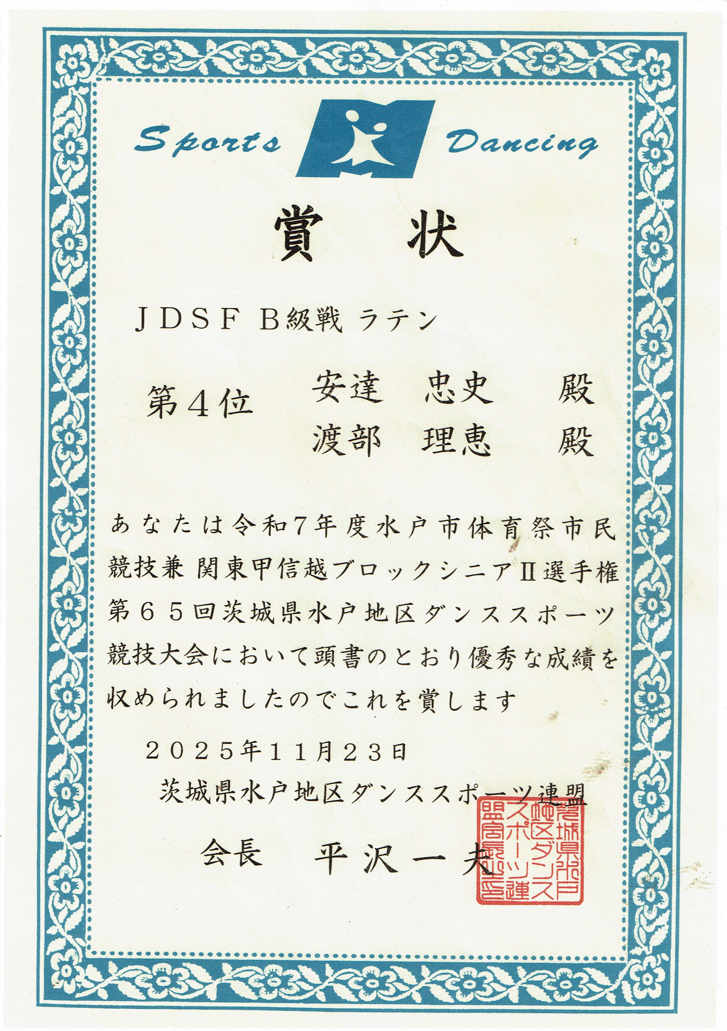 11月23日に行われました“第65回茨城県水戸地区ダンススポーツ競技会 JDSF B級戦ラテン”におきまして、当教室会員の『安達忠史・渡部理恵 組』が 第4位 という優秀な成績をおさめられました!おめでとうございました~ \(^0^)/