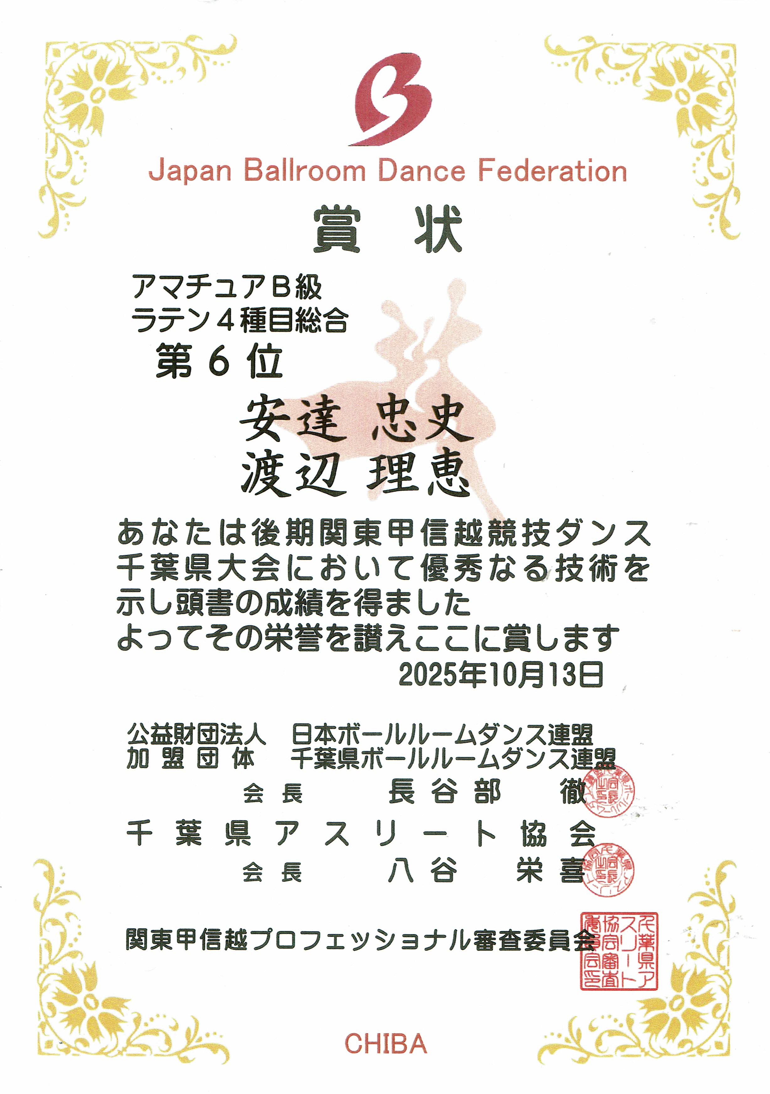 10月13日に行われました“後期関東甲信越競技ダンス千葉県大会 アマチュアB級ラテン4種目総合”におきまして、当教室会員の『安達忠史・渡部理恵 組』が 第6位 という優秀な成績をおさめられました!おめでとうございました~ \(^0^)/