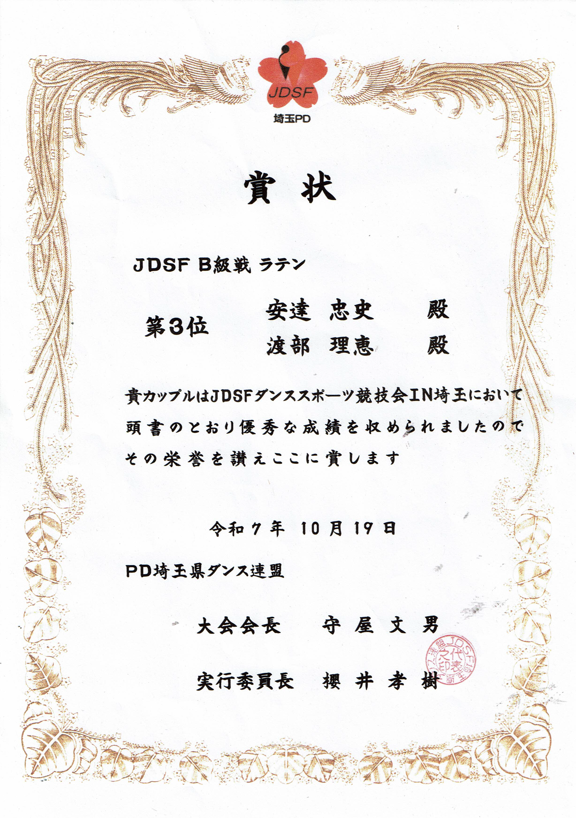 10月19日に行われました“JDSFダンススポーツ競技会IN埼玉 B級戦ラテン”におきまして、当教室会員の『安達忠史・渡部理恵 組』が 第3位 という優秀な成績をおさめられました!おめでとうございました~ \(^0^)/
