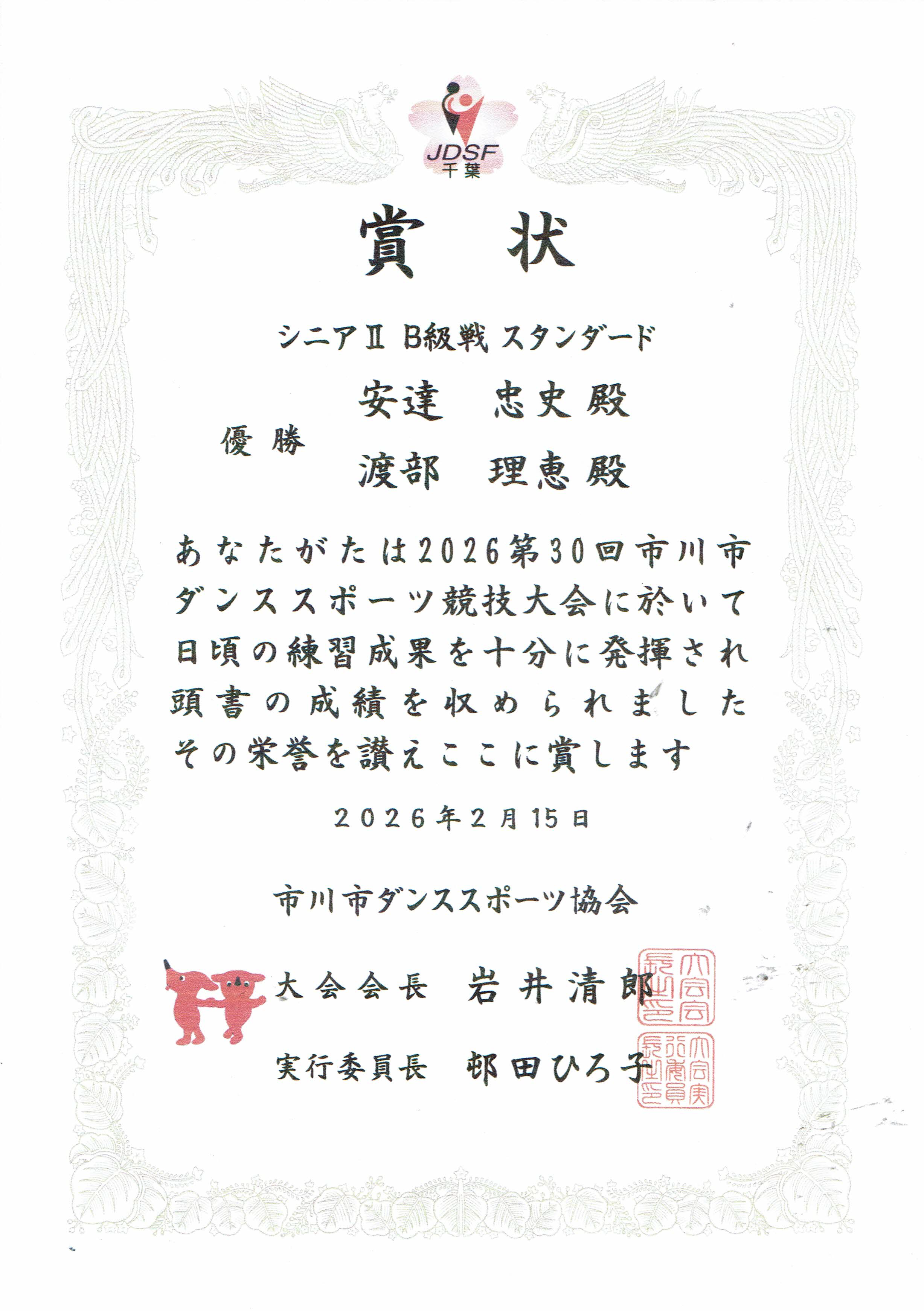 2月15日に行われました“第30回市川市ダンススポーツ競技大会 シニアⅡ B級戦スタンダード”におきまして、当教室会員の『安達忠史・渡部理恵 組』が 優勝 という優秀な成績をおさめられました!おめでとうございました~ \(^0^)/