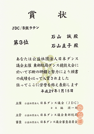 1月15日(日)に行われました“日本ダンス議会主催 東部総局ダンス競技会 B級ラテン部門”におきまして、 当教室会員の『石山 誠・石山 直子組』が見事3位という優秀な成績をおさめられました! おめでとうございました~ \(^0^)/