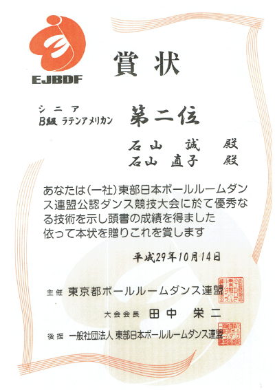 10月14日に行われました“EJBDF B級ラテンアメリカン部門”におきまして、 当教室会員の『石山 誠・石山 直子組』が見事第2位という優秀な成績をおさめられました! おめでとうございました~ \(^0^)/