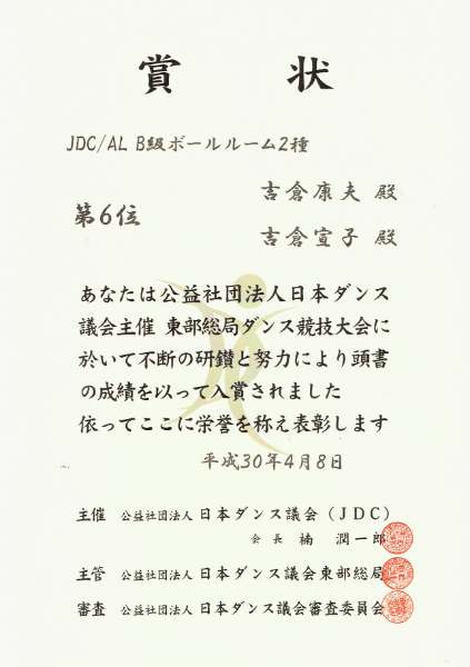 4月8日に行われました“JDC/AL B級ボールルーム2種”におきまして、 当教室会員の『吉倉 康夫・吉倉 宣子組』が見事第6位という優秀な成績をおさめられました! おめでとうございました~ \(^0^)/