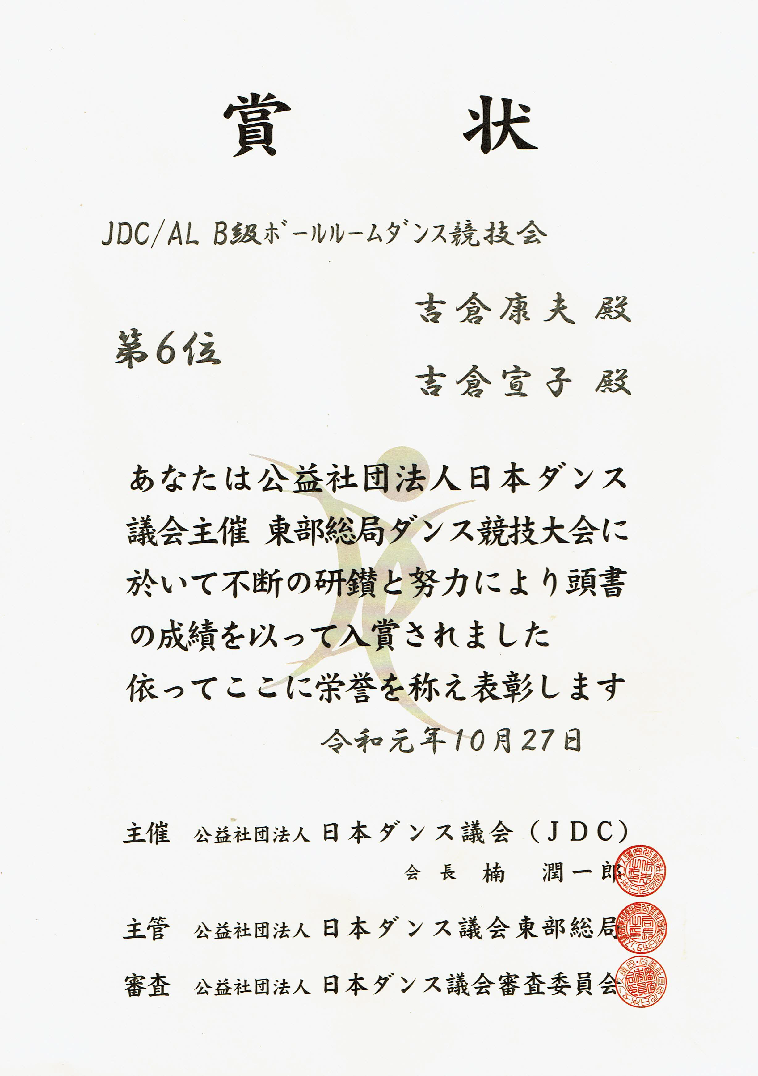 10月27日に行われました“JDC/AL B級ボールルームダンス競技会”におきまして、 当教室会員の『吉倉康夫・吉倉宣子 組』が見事 第6位 という優秀な成績をおさめられました! おめでとうございました~ \(^0^)/