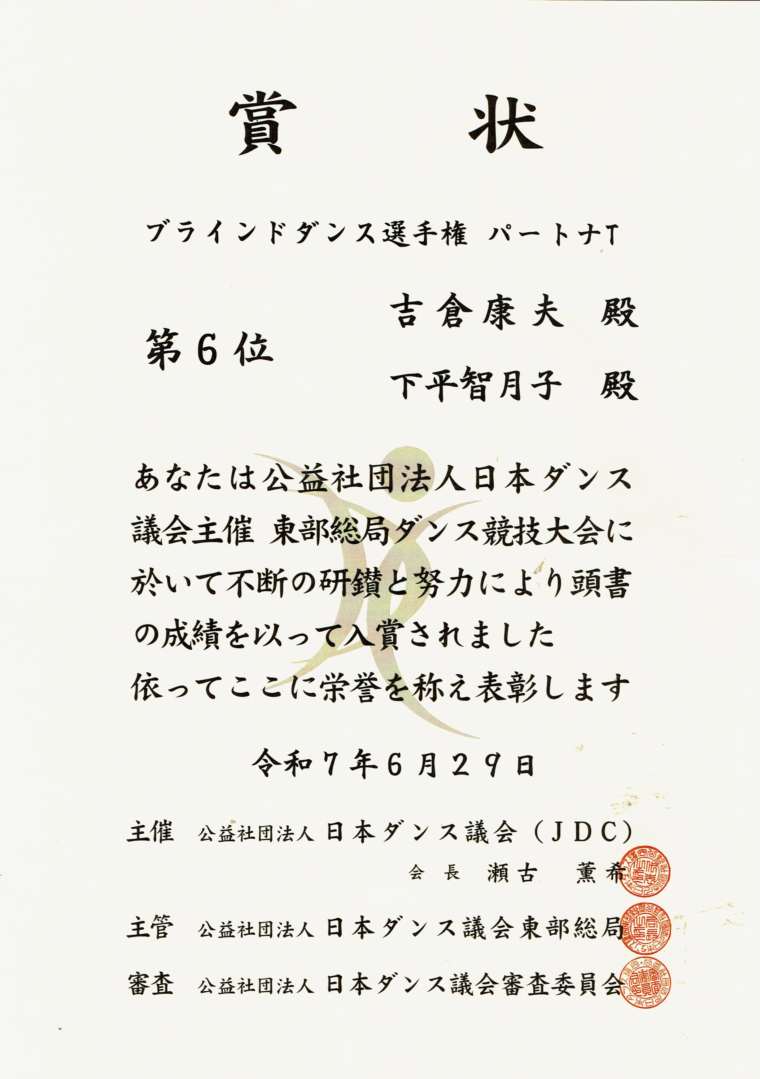 6月29日に行われました“JDC東部総局ダンス競技大会ブラインドダンス選手権パートナT”におきまして、当教室会員の『吉倉康夫・下平智月子 組』が 第6位 という優秀な成績をおさめられました!おめでとうございました~ \(^0^)/