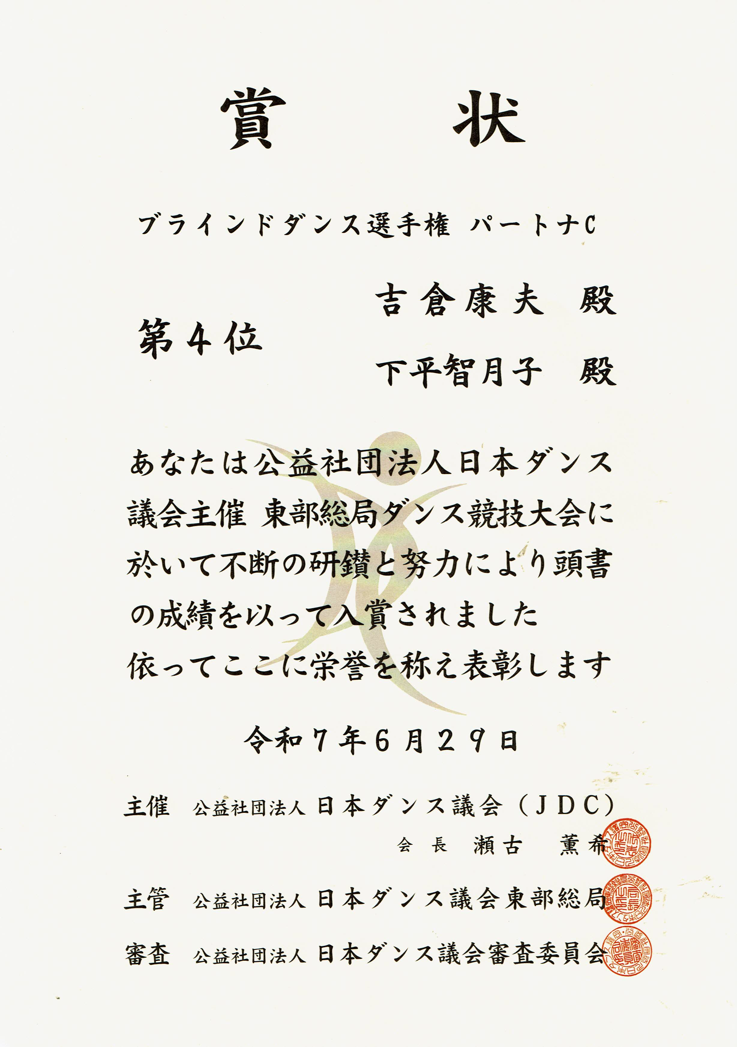 6月29日に行われました“JDC東部総局ダンス競技大会ブラインドダンス選手権パートナT”におきまして、当教室会員の『吉倉康夫・下平智月子 組』が 第4位 という優秀な成績をおさめられました!おめでとうございました~ \(^0^)/
