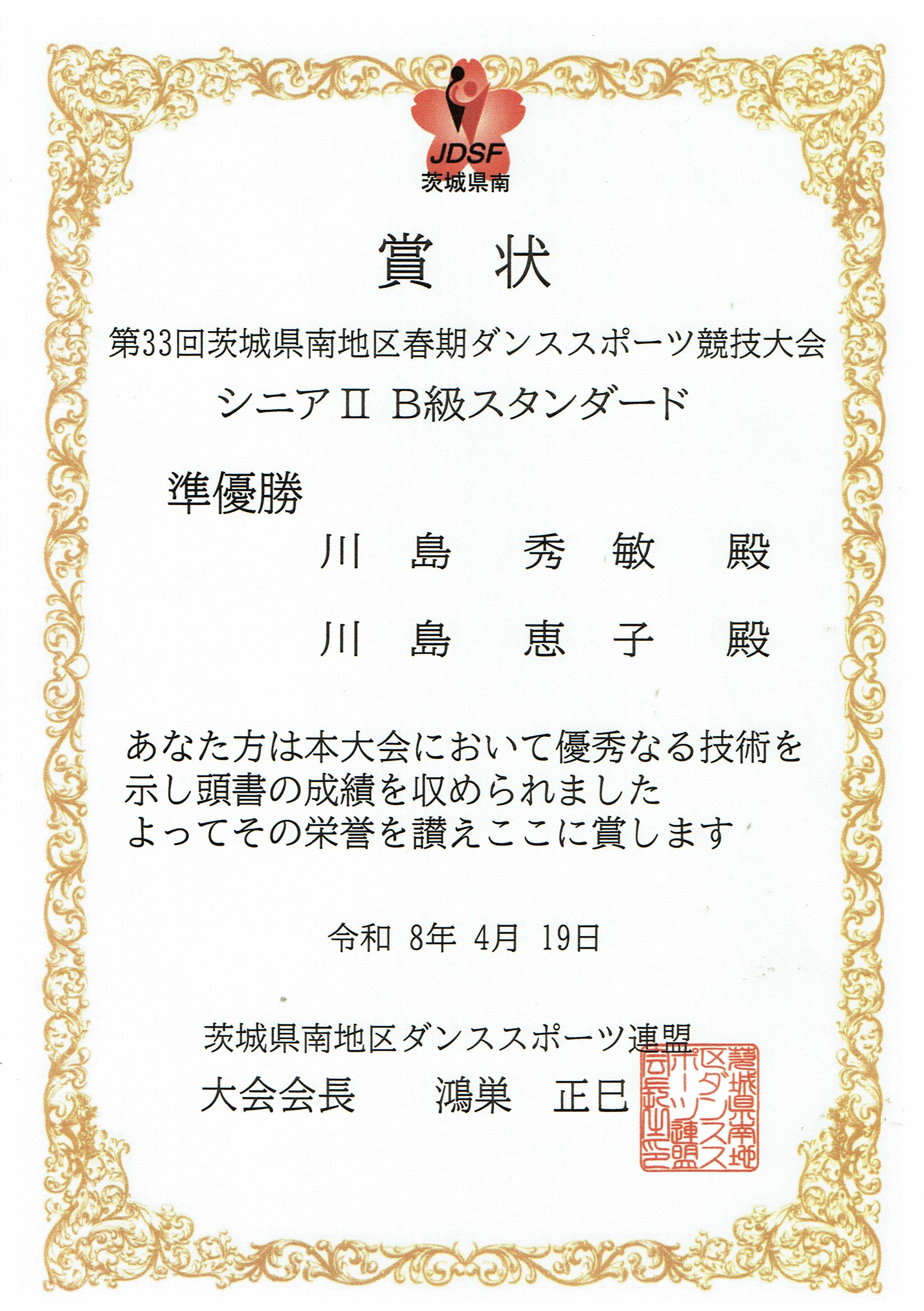 4月19日に行われました“第33回茨城県南地区春期ダンススポーツ競技大会 シニアⅡ B級スタンダード”におきまして、当教室会員の『川島秀敏・川島恵子 組』が 準優勝 という優秀な成績をおさめられました!おめでとうございました~ \(^0^)/